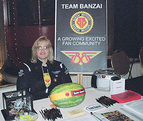 The music drew Banzai fans to the table like bees to honey. People would walk by, stop, look around to see where the sound was coming from, and hone in on the table with expressions of amazement on their faces. And the table looked fantastic. One fellow was so excited to see the Oscillation Overthruster replica on display, Pixisticks thought he was going to require clean underwear. The mini-watermelon at the table was a big attention-getter too. It received lots of "What's that watermelon doing there?" comments, especially after we tied a BB headband around it!