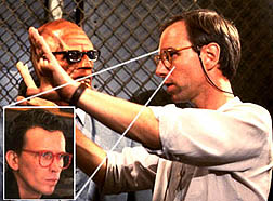 Dear Slim; The Boss says he is honored that you want to emulate him, but we can't offer any suggestions as to finding the glasses. I have heard of some having success at local thrift stores or "retro" shops. One thing to consider is (in the interest of security) those glasses in the film look nothing like the ones Buckaroo wears. No one here can recall Prop Master Erik Nelson mentioning where he found them. However, when I double checked my notes on the film's production, I did come across a clue. I'm not saying for sure (and keeping in the delightful spirit of childishness), but look at this picture of W.D Richter directing Christopher Lloyd. Compare it with the insert of Peter Weller and decide for yourselves. -R