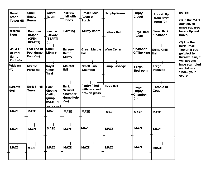 | The little dash marks indicate doors/exits to each room. Some rooms have one way doors until you do something like open the drapes etc. Then again some are one way no matter what you do. When you go into the maze, most doors IN to the maze are one way. Only way I know to get OUT of the maze is to find the pit at the end and jump it I did this map in the MS Paint program and did the whole thing by hand and it was not easy! I was thinking of putting it into excel format but I figured I would give this a shot. Sorry I am not an artist! The doors from the maze on the left and right that go off the map go to different maps which I have not mapped yet. |